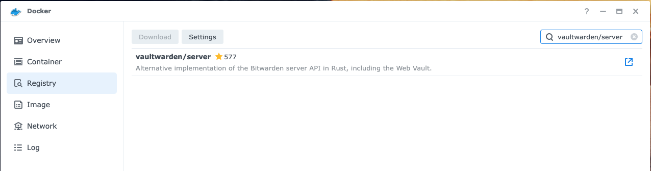 Then open the Docker package and download the Vaultwarden Docker image from Dockerhub as it is shown below: