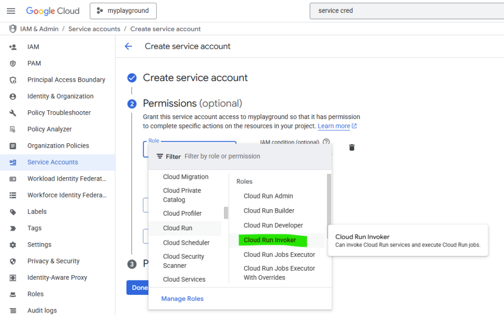 Assign the role ‘Cloud Run Invoke Service’ to your service account, as it is shown below: