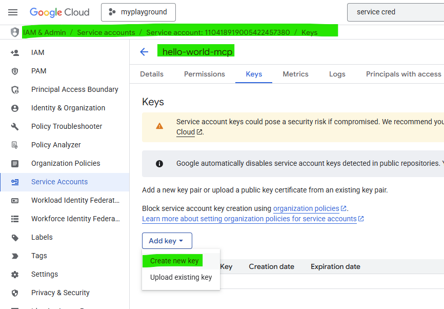 After successful creation of your Service Account user, you need to create a new JSON secret key file that your FastMCP test script will then use to authenticate against your MCP server.