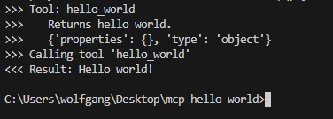 The Hello World MCP server is one of the most simplistic MCP servers possible, which just offers a stateless tool without any parameters that greets the caller with returning the string ‘Hello world’.