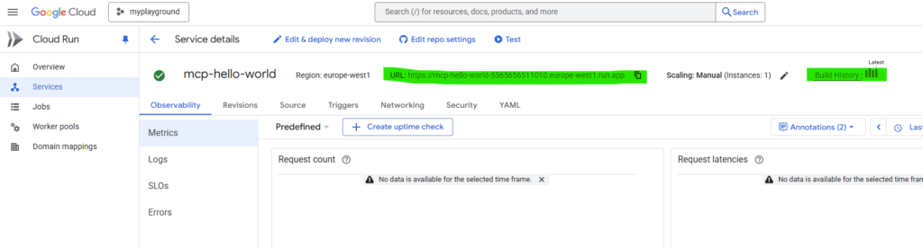 After the Cloud Build setup is complete, you have your HelloWorld MCP server up and running as a Google Cloud Run service, as it is shown below. The URL shows the HTTPS address Google assigned to your MCP server, that you can now use in your FastMCP test instead of the local ‘127.0.01’ address.