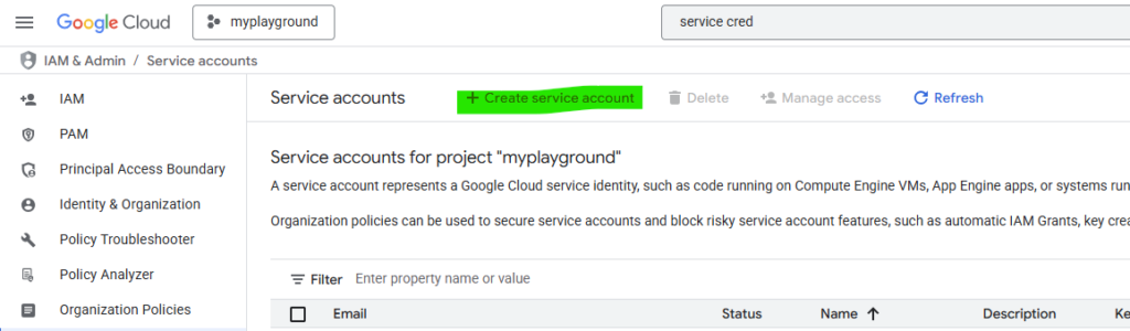 Now we need to navigate to the Services Accounts page and create a new Service account, as shown below: